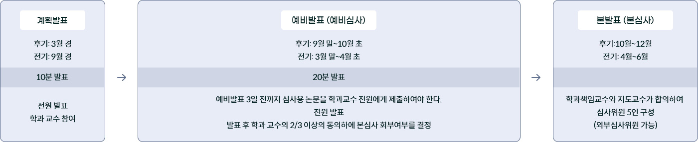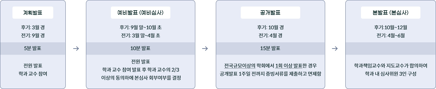 - 박사과정 동안 SCI(E)급 논문 1편 포함한 등재후보지 이상의 논문을 총 2편 이상 게재하고, 아울러 국제 규모이상의 학술회의에서 1회 이상 발표해야 한다.