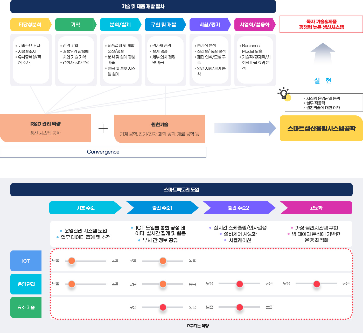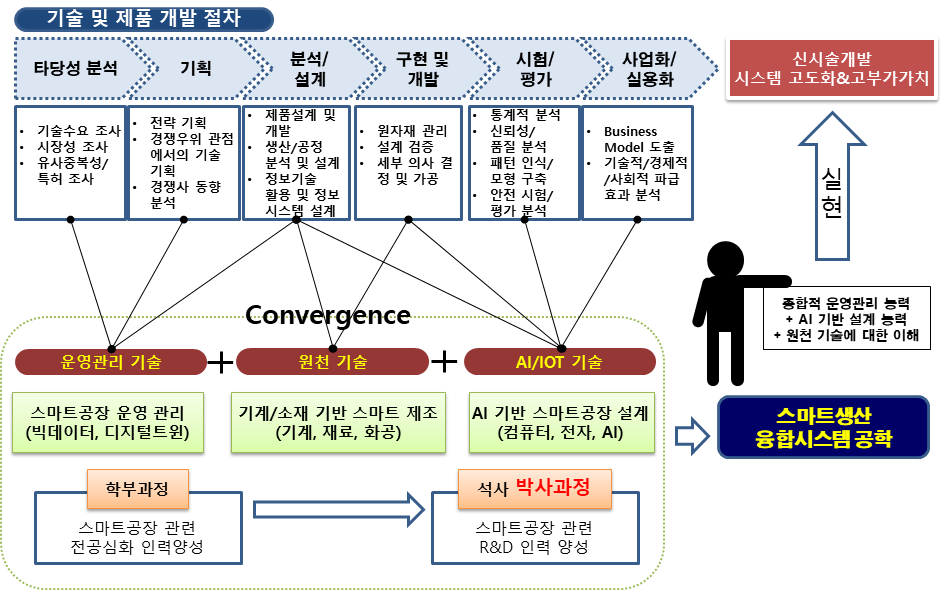 - 박사과정스마트제조시스템에 대한 이해를 바탕으로 ICT(AI/컴퓨터공학), 요소기술(기계공학/신소재공학/전자공학/화학공학) 및 운영기술(산업경영공학/환경공학)을 융합하여 중소기업 운영상의 문제를 해결하는 R&D 역량과 나아가 신사업 창출과 중소기업형 CTO 혁신역량을 갖춘 전문가 양성을 목표로 함.