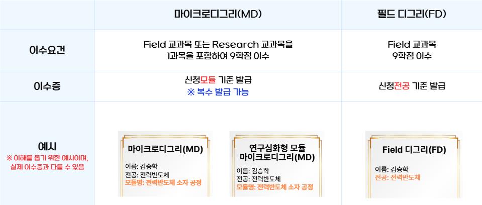 • FD는 신청 연합전공 내 Field 교과목 만으로 9학점 이수 시 이수증 발급